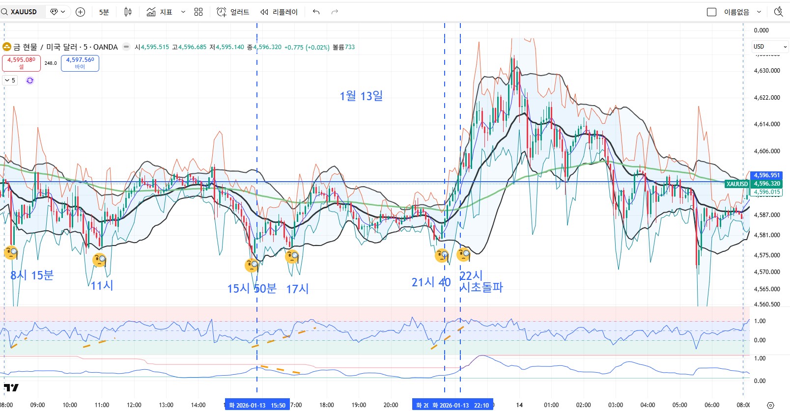 1월 13일 : 비록 시초 아래지만 하락추세로 가지 않고 횡보구간 이런날은 20BB 하단 눌림에서 비중 높이고 거래함